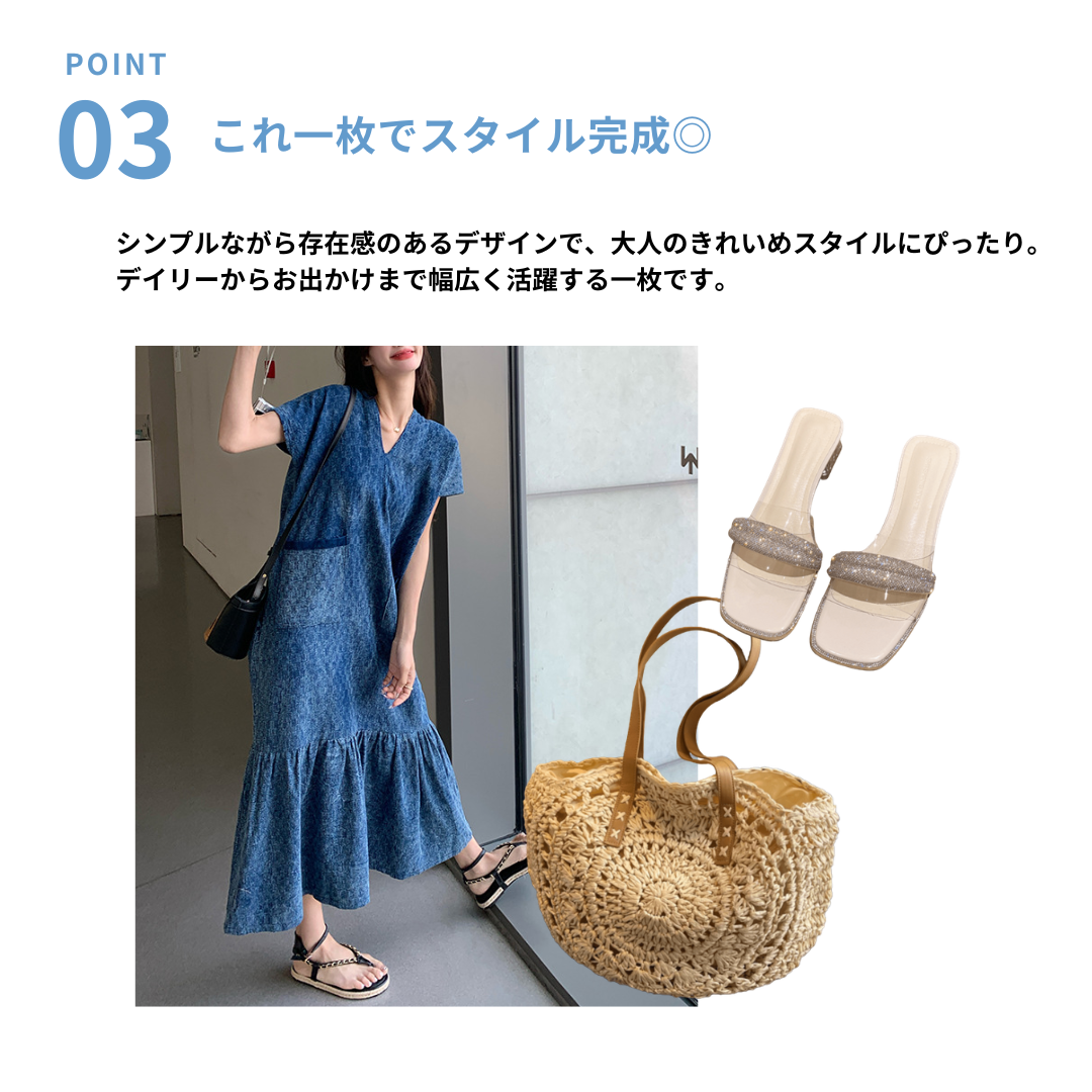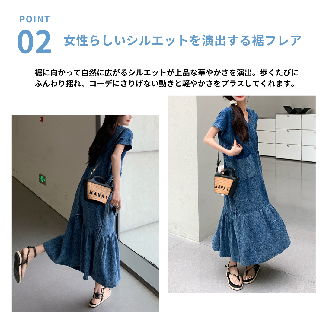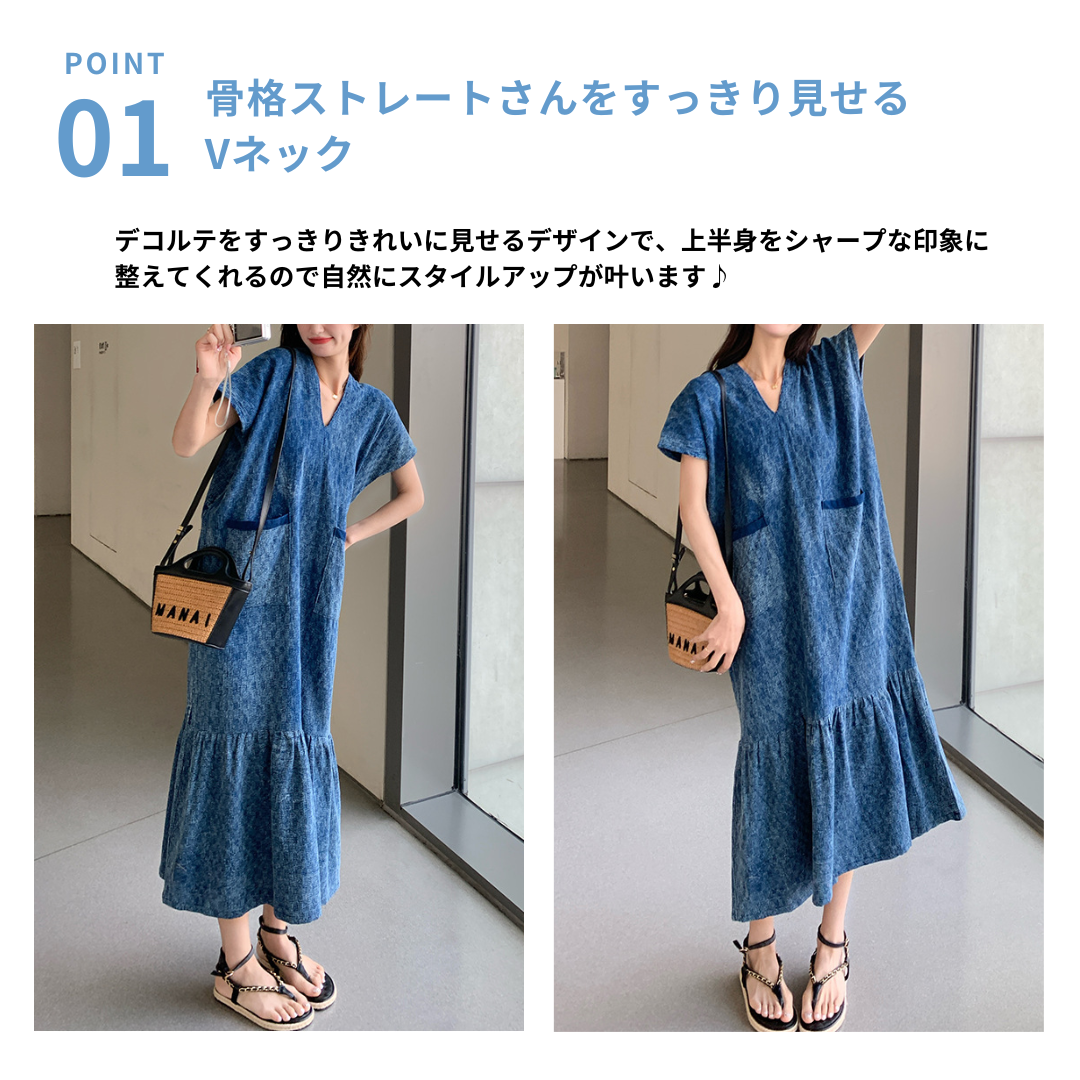 すっきりとしたVネックと上品に広がる裾フレアが魅力のワンピース。上半身はシンプルなデザインで骨格ストレートさんの体型をきれいに引き立て、裾に向かって広がるシルエットが女性らしさをプラスします。縦のラインを意識したデザインでスタイルアップ効果も◎。一枚で上品な大人コーデが完成するワンピースです。
