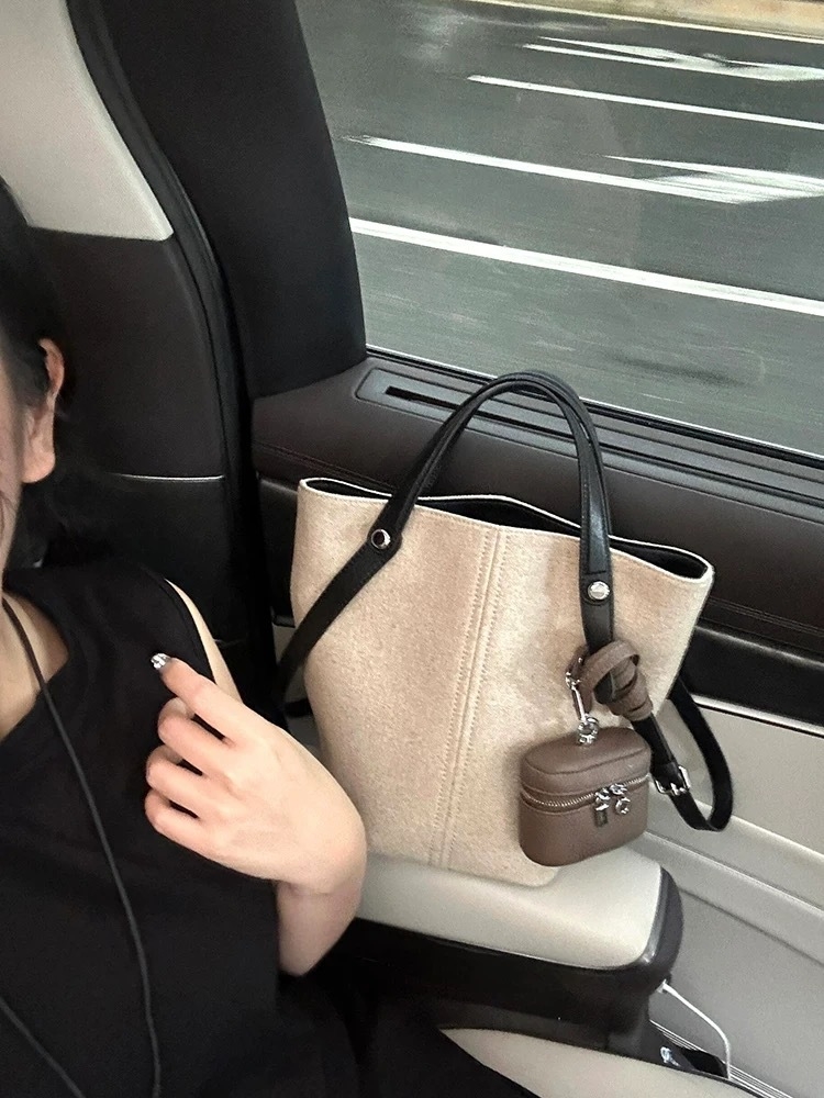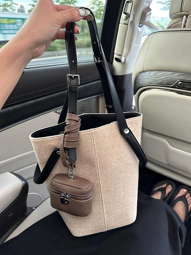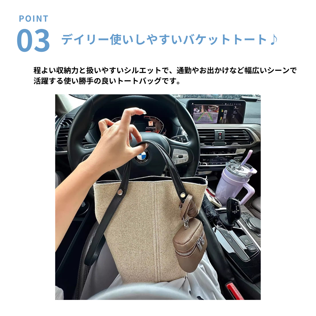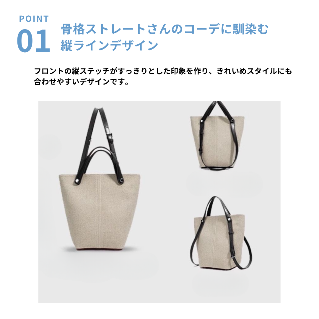 上品な印象を演出するキャンバス×リアルレザーバケットトート。中央のステッチラインが視覚的に縦のラインを強調し、骨格ストレートさんのきれいめスタイルにも自然に馴染みます。ナチュラルなキャンバス素材にリアルレザーの持ち手を組み合わせることで、カジュアルすぎない大人の上品さをプラス。程よいサイズ感でデイリーからお出かけまで幅広く活躍するトートバッグです。 *ポーチは付属しておりません。