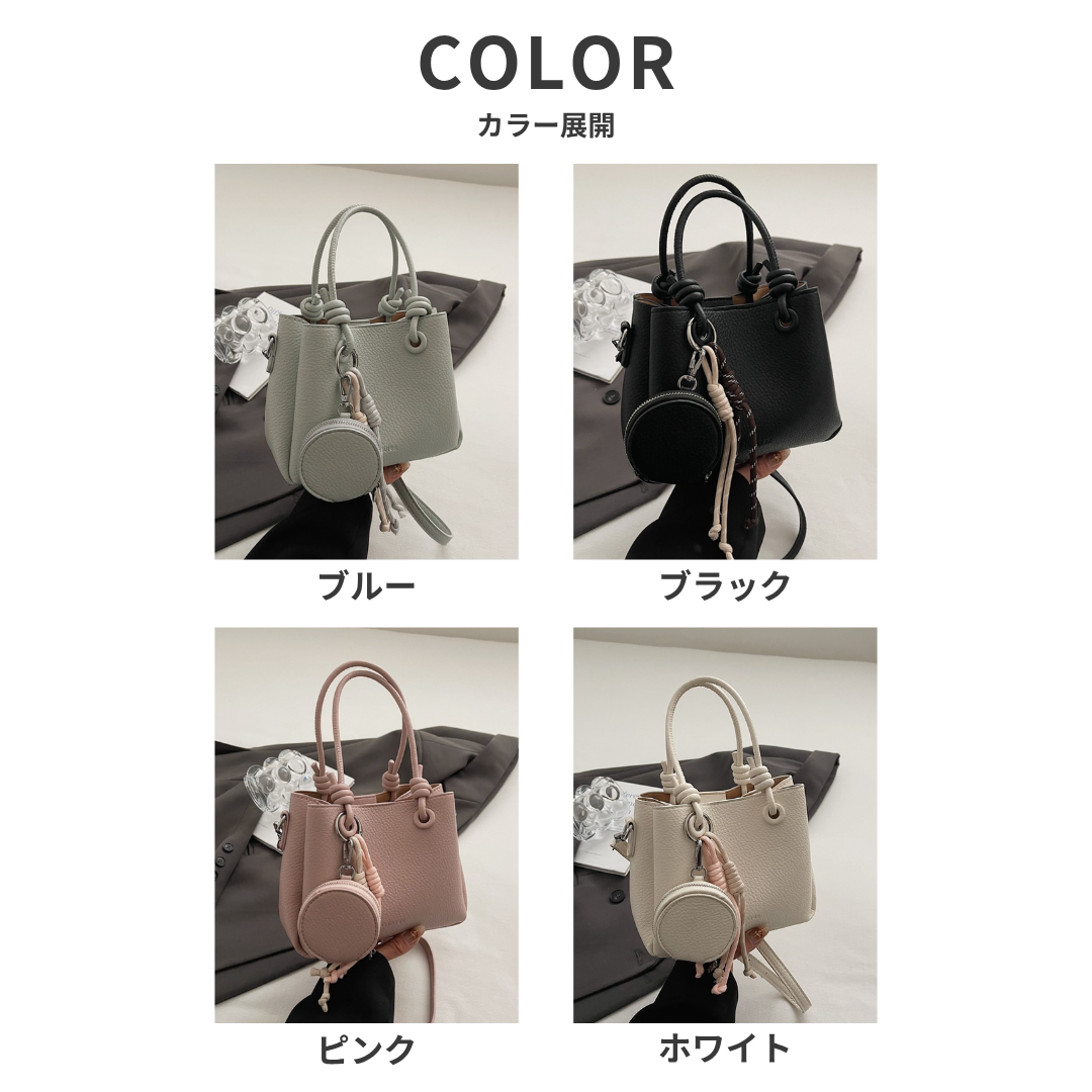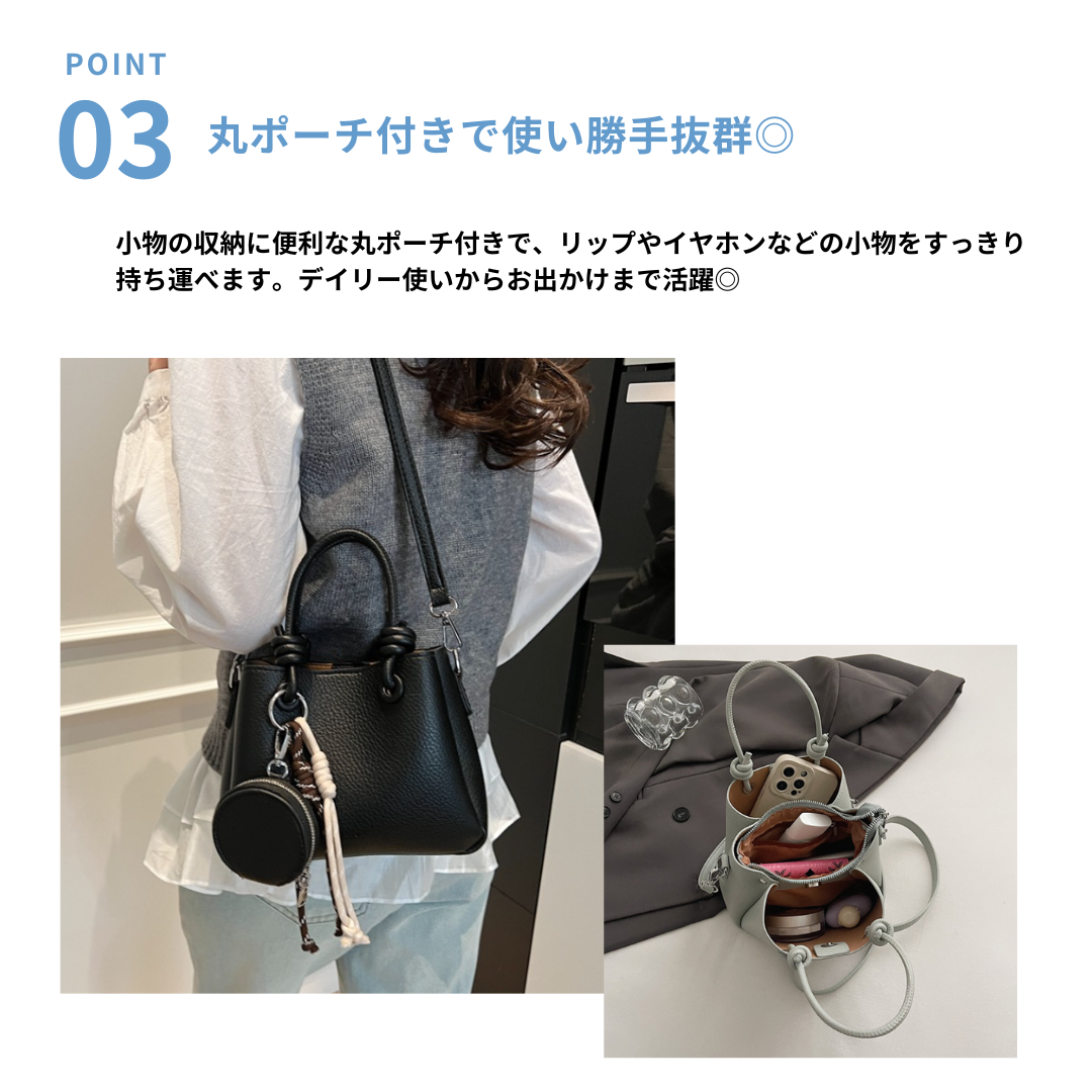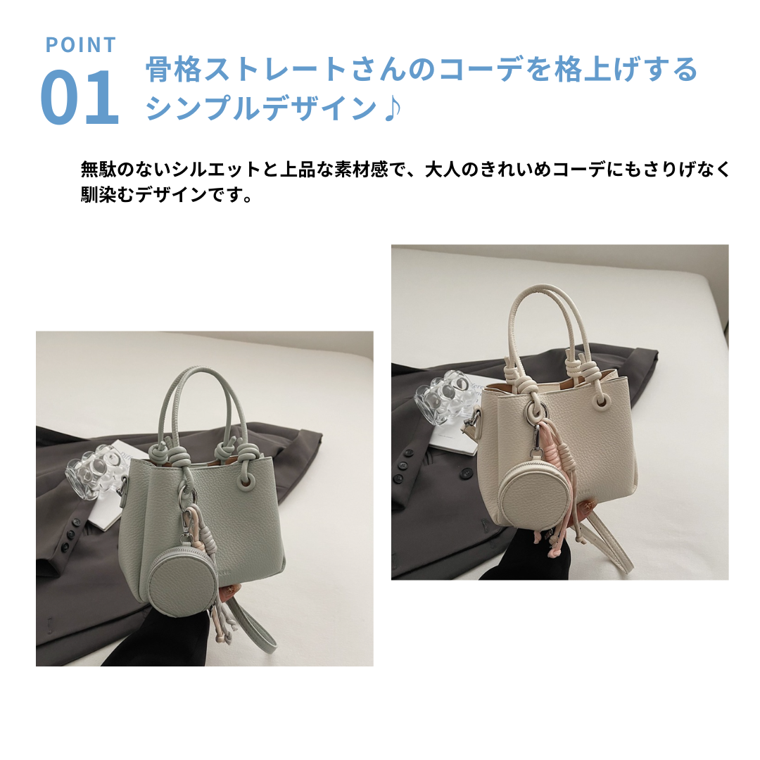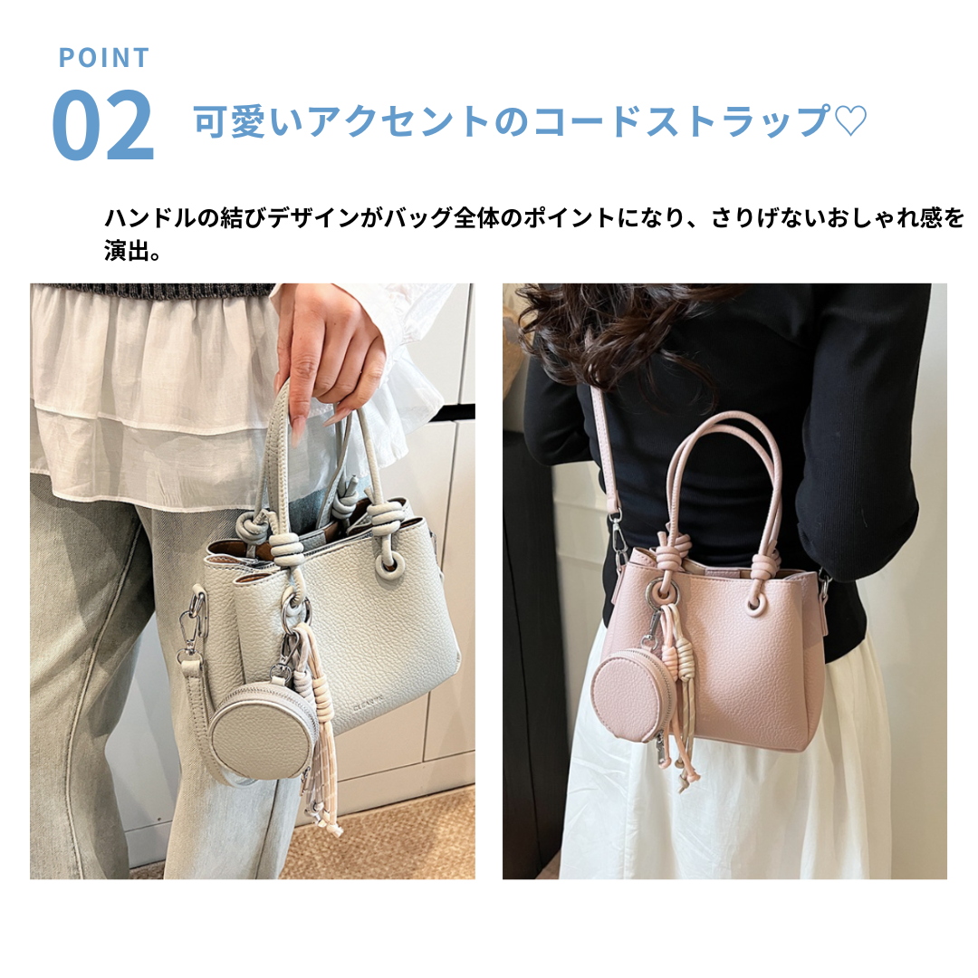 ころんとしたフォルムが可愛い、コードストラップデザインのハンドバッグ。上品なシボ感のある素材とシンプルなシルエットで、骨格ストレートさんのきれいめスタイルにも馴染みやすいデザインです。結び目デザインのハンドルがアクセントになり、コーデに程よいこなれ感をプラス。丸型ポーチ付きで小物の整理もしやすく、デイリーからお出かけまで活躍する大人のミニバッグです。