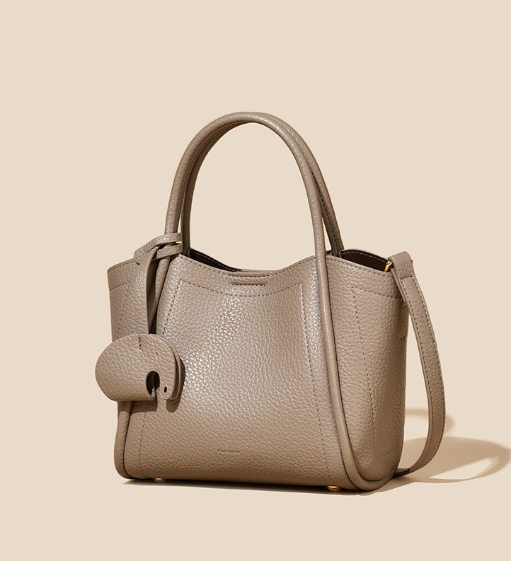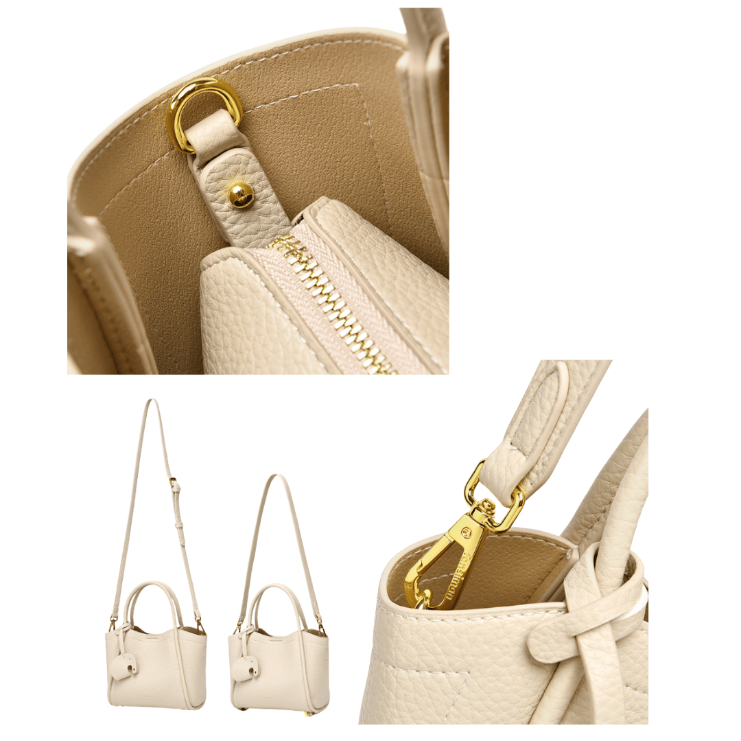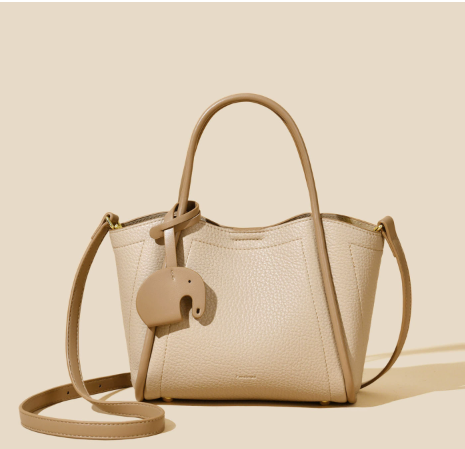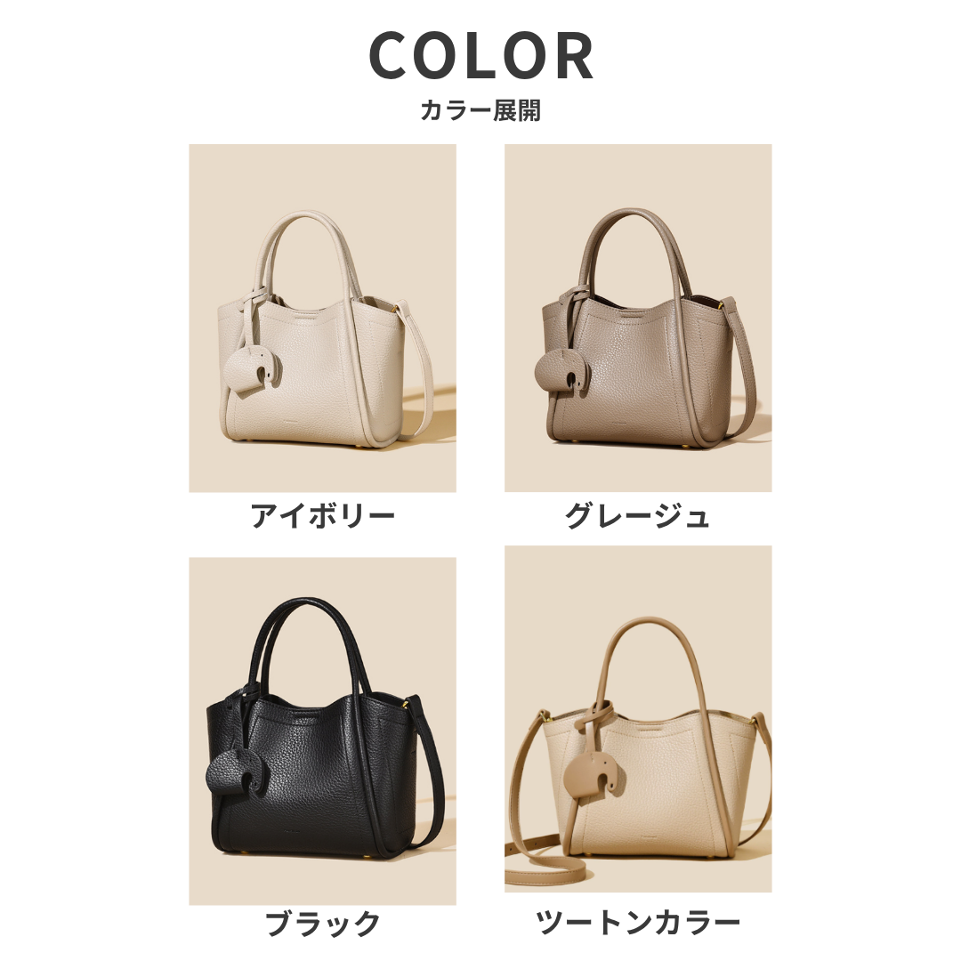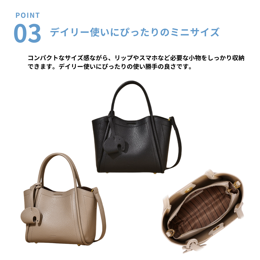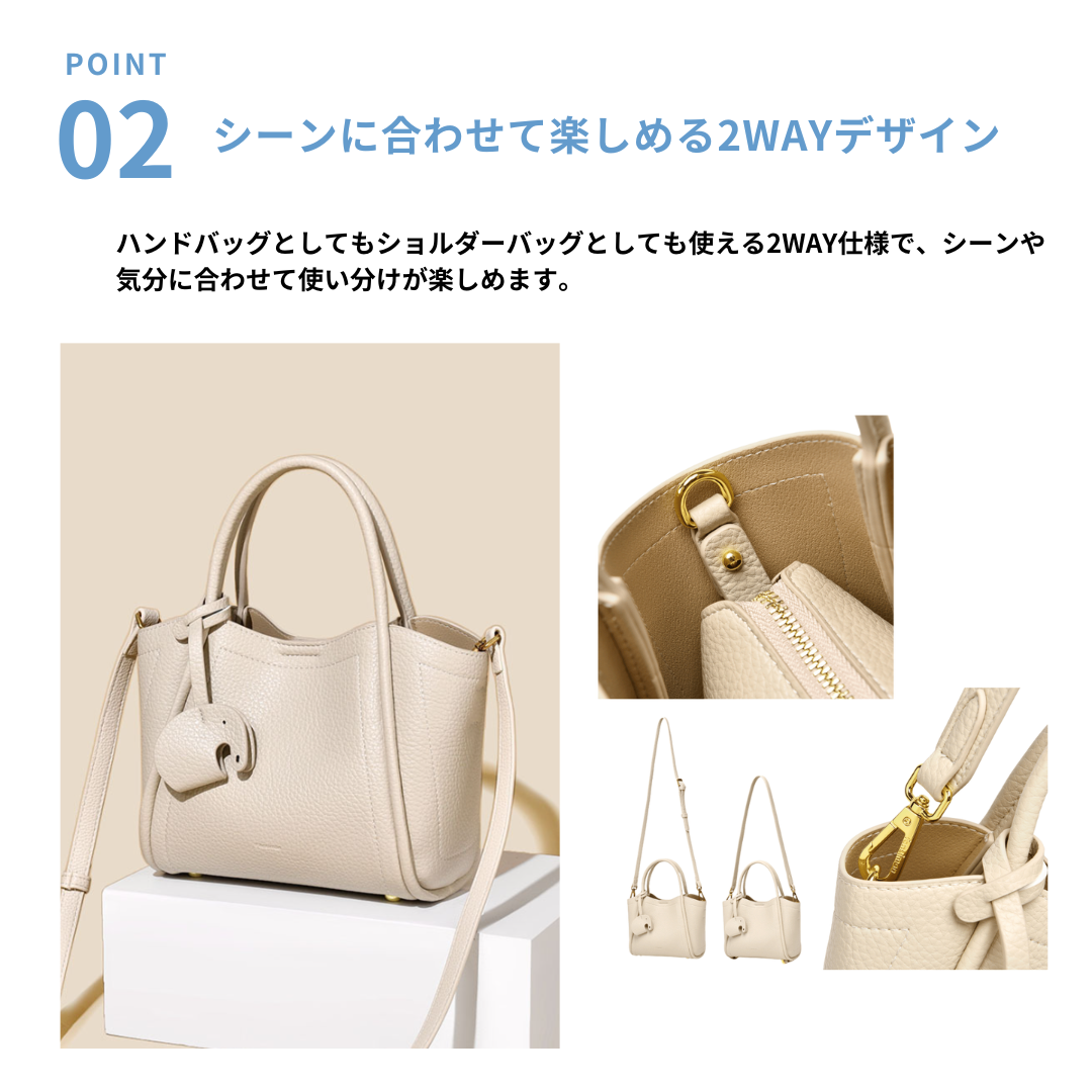 コンパクトながら上品な存在感を放つミニトートショルダーバッグ。シンプルで洗練されたフォルムが、骨格ストレートさんのきれいめスタイルにも自然に馴染みます。上品なシボ感素材と柔らかなカラーが大人のコーデに程よいアクセントをプラス。ハンドバッグとしてもショルダーバッグとしても使える2WAY仕様で、デイリーからお出かけまで幅広く活躍する万能バッグです。 ※チャームは付属しておりません。