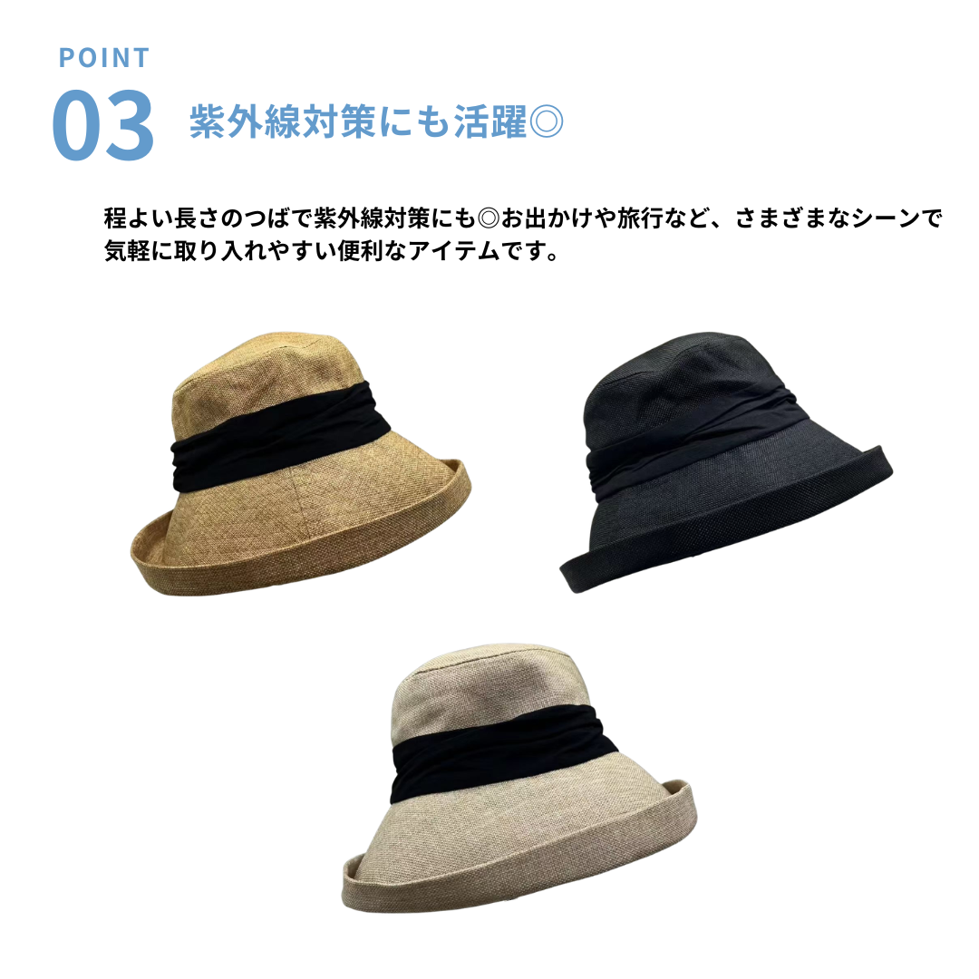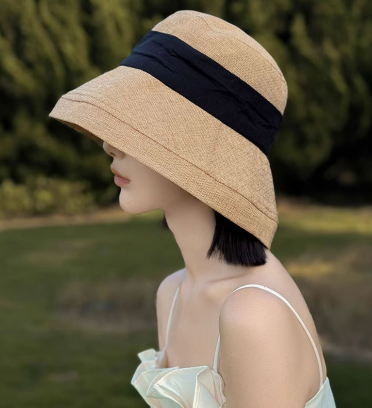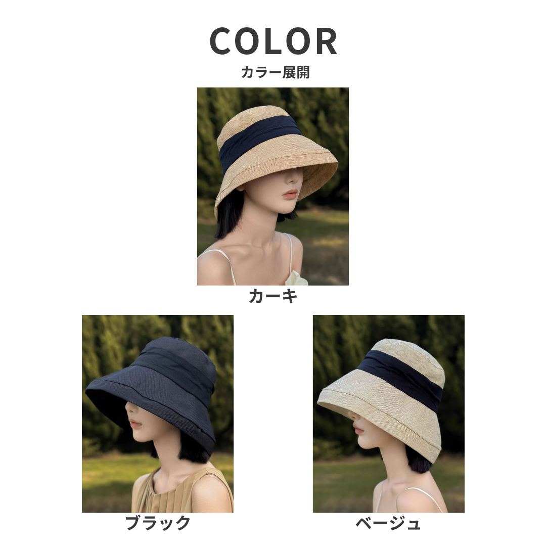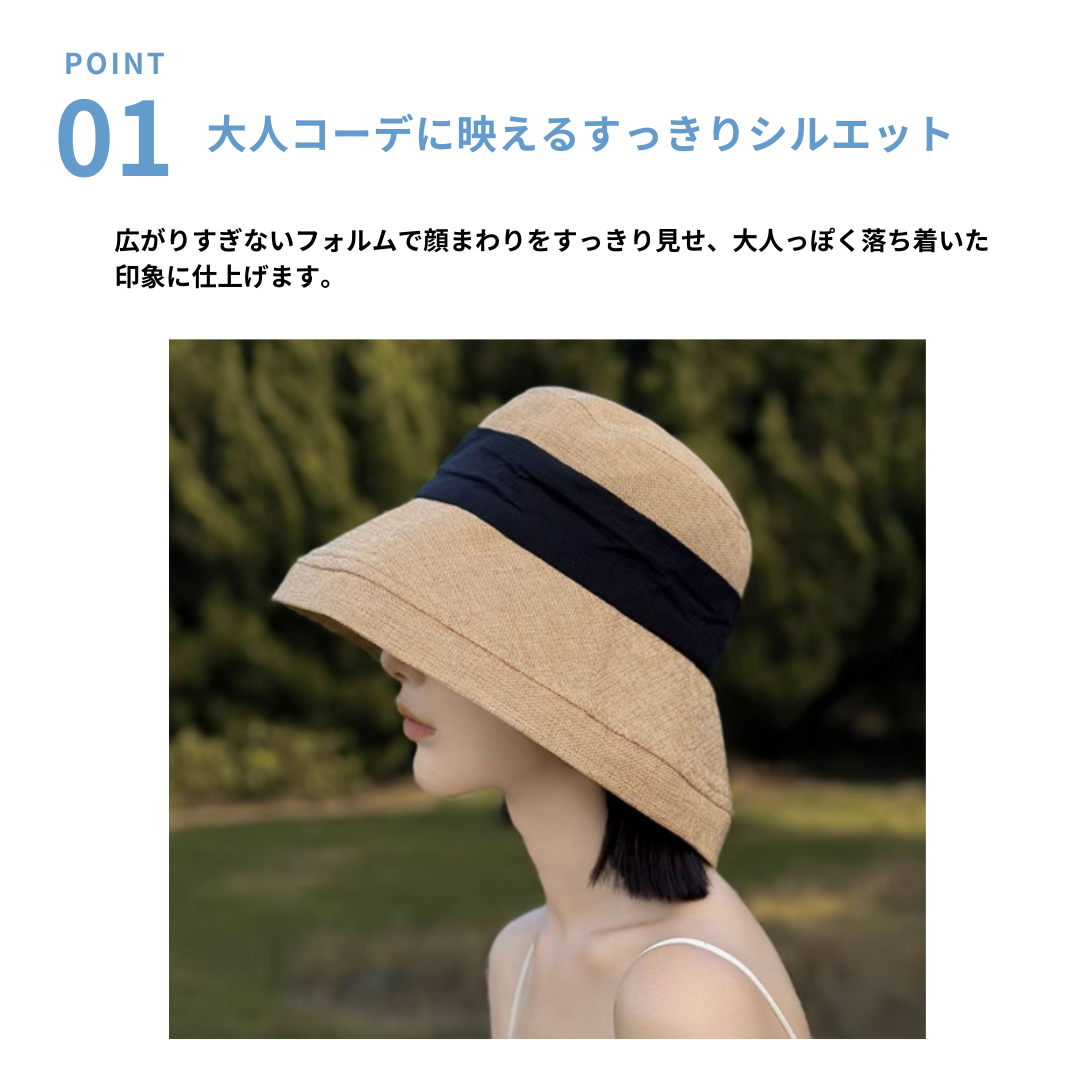 ナチュラルな素材感と上品なリボンデザインが魅力のバケットハット。程よい広さのつばが顔まわりをすっきり見せ、骨格ストレートさんのきれいめカジュアルスタイルにも自然に馴染みます。シンプルながらアクセントになるリボンが、大人の上品さをプラス。日差し対策にもぴったりで、デイリーのお出かけからリゾートスタイルまで活躍する万能ハットです。