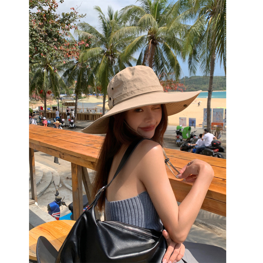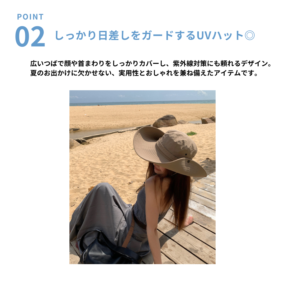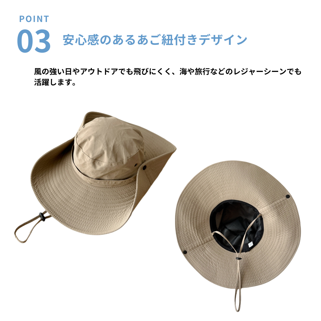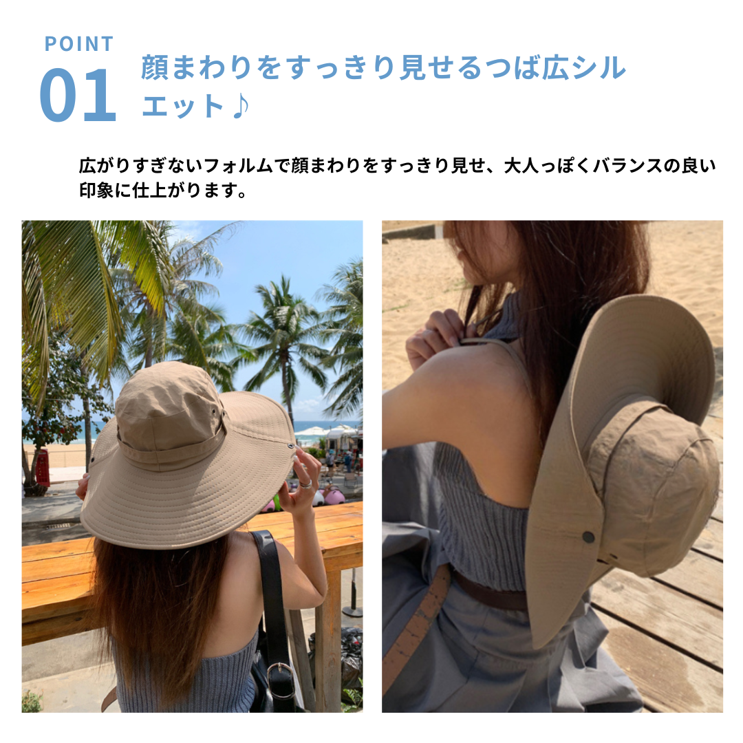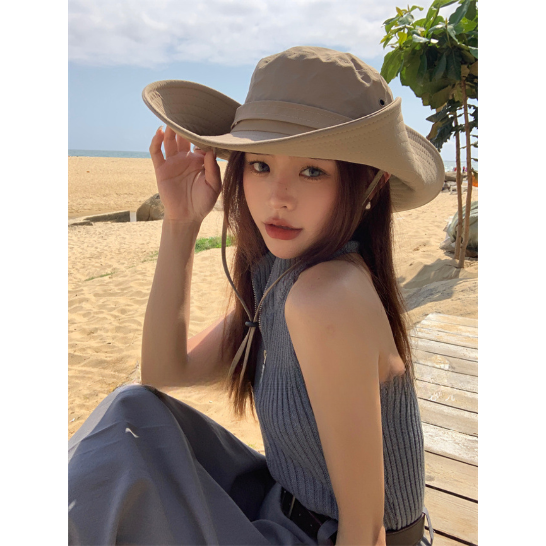 広めのつばでしっかり日差しをカバーするUV対策カウボーイハット。顔まわりを包み込むつば広デザインが日よけとして活躍しながら、骨格ストレートさんのすっきりしたスタイルにも自然に馴染みます。軽やかな素材感で長時間の着用も快適。あご紐付きで風の強い日やアウトドアシーンでも安心して使える、旅行やレジャーにもぴったりの実用的なハットです。